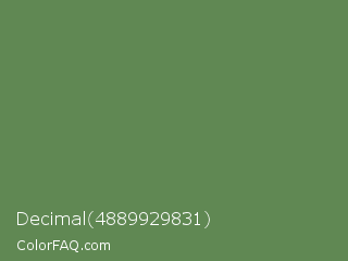 Decimal 4889929831 Color is a normal green color and the nearest color is Glade Green #61845f. Hex code #608853 and RGB value is rgb(96,136,83). In RGB color space, this color is composed of 38% red, 53% green, 33% blue, In CMYK color space, this color is composed of 29% cyan, 0% magenta, 39% yellow , 47% black , In HSL color space, this color has a hue angle of 105° , 24% saturation and 43% lightness.