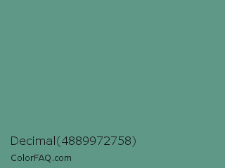 Decimal 4889972758 Color is a normal green color and the nearest color is Patina #639a8f. Hex code #609888 and RGB value is rgb(96,152,136). In RGB color space, this color is composed of 38% red, 60% green, 53% blue, In CMYK color space, this color is composed of 37% cyan, 0% magenta, 11% yellow , 40% black , In HSL color space, this color has a hue angle of 163° , 23% saturation and 49% lightness.