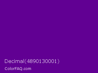 Decimal 4890130001 Color is a dark purple color and the nearest color is Purple #660099. Hex code #610093 and RGB value is rgb(97,0,147). In RGB color space, this color is composed of 38% red, 0% green, 58% blue, In CMYK color space, this color is composed of 34% cyan, 100% magenta, 0% yellow , 42% black , In HSL color space, this color has a hue angle of 280° , 100% saturation and 29% lightness.