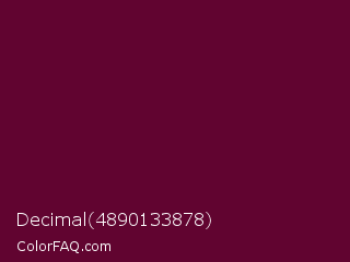 Decimal 4890133878 Color is a very dark rose color and the nearest color is Black Rose #67032d. Hex code #610430 and RGB value is rgb(97,4,48). In RGB color space, this color is composed of 38% red, 2% green, 19% blue, In CMYK color space, this color is composed of 0% cyan, 96% magenta, 51% yellow , 62% black , In HSL color space, this color has a hue angle of 332° , 92% saturation and 20% lightness.