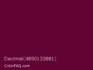 Decimal 4890133881 Color is a very dark rose color and the nearest color is Mulberry Wood #5c0536. Hex code #610433 and RGB value is rgb(97,4,51). In RGB color space, this color is composed of 38% red, 2% green, 20% blue, In CMYK color space, this color is composed of 0% cyan, 96% magenta, 47% yellow , 62% black , In HSL color space, this color has a hue angle of 330° , 92% saturation and 20% lightness.