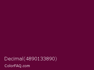 Decimal 4890133890 Color is a very dark rose color and the nearest color is Mulberry Wood #5c0536. Hex code #610436 and RGB value is rgb(97,4,54). In RGB color space, this color is composed of 38% red, 2% green, 21% blue, In CMYK color space, this color is composed of 0% cyan, 96% magenta, 44% yellow , 62% black , In HSL color space, this color has a hue angle of 328° , 92% saturation and 20% lightness.