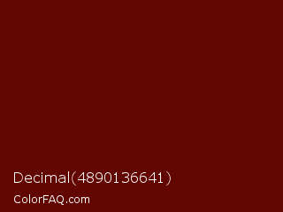 Decimal 4890136641 Color is a very dark red color and the nearest color is Rosewood #65000b. Hex code #610601 and RGB value is rgb(97,6,1). In RGB color space, this color is composed of 38% red, 2% green, 0% blue, In CMYK color space, this color is composed of 0% cyan, 94% magenta, 99% yellow , 62% black , In HSL color space, this color has a hue angle of 3° , 98% saturation and 19% lightness.