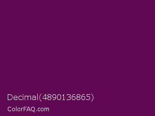 Decimal 4890136865 Color is a very dark magenta color and the nearest color is Pompadour #660045. Hex code #610651 and RGB value is rgb(97,6,81). In RGB color space, this color is composed of 38% red, 2% green, 32% blue, In CMYK color space, this color is composed of 0% cyan, 94% magenta, 16% yellow , 62% black , In HSL color space, this color has a hue angle of 311° , 88% saturation and 20% lightness.
