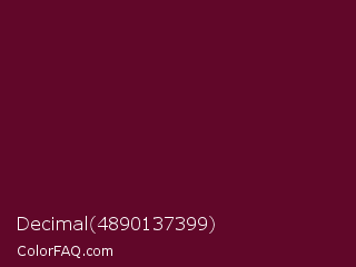 Decimal 4890137399 Color is a very dark rose color and the nearest color is Black Rose #67032d. Hex code #610729 and RGB value is rgb(97,7,41). In RGB color space, this color is composed of 38% red, 3% green, 16% blue, In CMYK color space, this color is composed of 0% cyan, 93% magenta, 58% yellow , 62% black , In HSL color space, this color has a hue angle of 337° , 87% saturation and 20% lightness.