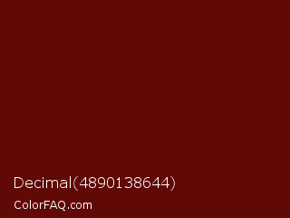 Decimal 4890138644 Color is a very dark red color and the nearest color is Rosewood #65000b. Hex code #610906 and RGB value is rgb(97,9,6). In RGB color space, this color is composed of 38% red, 4% green, 2% blue, In CMYK color space, this color is composed of 0% cyan, 91% magenta, 94% yellow , 62% black , In HSL color space, this color has a hue angle of 2° , 88% saturation and 20% lightness.