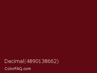 Decimal 4890138662 Color is a very dark red color and the nearest color is Dark Tan #661010. Hex code #610912 and RGB value is rgb(97,9,18). In RGB color space, this color is composed of 38% red, 4% green, 7% blue, In CMYK color space, this color is composed of 0% cyan, 91% magenta, 81% yellow , 62% black , In HSL color space, this color has a hue angle of 354° , 83% saturation and 21% lightness.