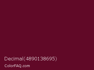 Decimal 4890138695 Color is a very dark rose color and the nearest color is Black Rose #67032d. Hex code #610927 and RGB value is rgb(97,9,39). In RGB color space, this color is composed of 38% red, 4% green, 15% blue, In CMYK color space, this color is composed of 0% cyan, 91% magenta, 60% yellow , 62% black , In HSL color space, this color has a hue angle of 340° , 83% saturation and 21% lightness.