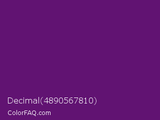 Decimal 4890567810 Color is a dark purple color and the nearest color is Honey Flower #4f1c70. Hex code #611372 and RGB value is rgb(97,19,114). In RGB color space, this color is composed of 38% red, 7% green, 45% blue, In CMYK color space, this color is composed of 15% cyan, 83% magenta, 0% yellow , 55% black , In HSL color space, this color has a hue angle of 289° , 71% saturation and 26% lightness.