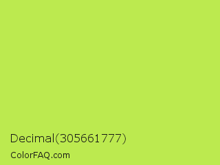 Decimal 305661777 Color is a light lime color and the nearest color is Inchworm #b2ec5d. Hex code #bcea4f and RGB value is rgb(188,234,79). In RGB color space, this color is composed of 74% red, 92% green, 31% blue, In CMYK color space, this color is composed of 20% cyan, 0% magenta, 66% yellow , 8% black , In HSL color space, this color has a hue angle of 78° , 79% saturation and 61% lightness.