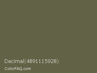 Decimal 4891115928 Color is a normal yellow color and the nearest color is Finch #626649. Hex code #626246 and RGB value is rgb(98,98,70). In RGB color space, this color is composed of 38% red, 38% green, 27% blue, In CMYK color space, this color is composed of 0% cyan, 0% magenta, 29% yellow , 62% black , In HSL color space, this color has a hue angle of 60° , 17% saturation and 33% lightness.