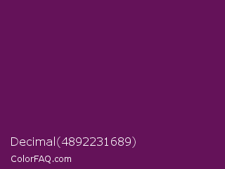 Decimal 4892231689 Color is a dark magenta color and the nearest color is Palatinate Purple #682860. Hex code #641259 and RGB value is rgb(100,18,89). In RGB color space, this color is composed of 39% red, 7% green, 35% blue, In CMYK color space, this color is composed of 0% cyan, 82% magenta, 11% yellow , 61% black , In HSL color space, this color has a hue angle of 308° , 69% saturation and 23% lightness.