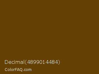 Decimal 4899014484 Color is a very dark orange color and the nearest color is Nutmeg Wood Finish #683600. Hex code #644102 and RGB value is rgb(100,65,2). In RGB color space, this color is composed of 39% red, 25% green, 1% blue, In CMYK color space, this color is composed of 0% cyan, 35% magenta, 98% yellow , 61% black , In HSL color space, this color has a hue angle of 39° , 96% saturation and 20% lightness.