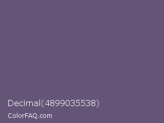 Decimal 4899035538 Color is a normal violet color and the nearest color is Smoky #605b73. Hex code #645578 and RGB value is rgb(100,85,120). In RGB color space, this color is composed of 39% red, 33% green, 47% blue, In CMYK color space, this color is composed of 17% cyan, 29% magenta, 0% yellow , 53% black , In HSL color space, this color has a hue angle of 266° , 17% saturation and 40% lightness.