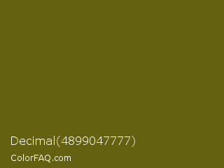Decimal 4899047777 Color is a dark yellow color and the nearest color is Himalaya #6a5d1b. Hex code #646111 and RGB value is rgb(100,97,17). In RGB color space, this color is composed of 39% red, 38% green, 7% blue, In CMYK color space, this color is composed of 0% cyan, 3% magenta, 83% yellow , 61% black , In HSL color space, this color has a hue angle of 58° , 71% saturation and 23% lightness.