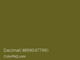 Decimal 4899047799 Color is a dark yellow color and the nearest color is Antique Bronze #665d1e. Hex code #646121 and RGB value is rgb(100,97,33). In RGB color space, this color is composed of 39% red, 38% green, 13% blue, In CMYK color space, this color is composed of 0% cyan, 3% magenta, 67% yellow , 61% black , In HSL color space, this color has a hue angle of 57° , 50% saturation and 26% lightness.