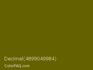 Decimal 4899049984 Color is a very dark yellow color and the nearest color is Bronze Yellow #737000. Hex code #646200 and RGB value is rgb(100,98,0). In RGB color space, this color is composed of 39% red, 38% green, 0% blue, In CMYK color space, this color is composed of 0% cyan, 2% magenta, 100% yellow , 61% black , In HSL color space, this color has a hue angle of 59° , 100% saturation and 20% lightness.