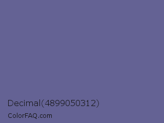 Decimal 4899050312 Color is a normal indigo color and the nearest color is Dark Blue Gray #666699. Hex code #646294 and RGB value is rgb(100,98,148). In RGB color space, this color is composed of 39% red, 38% green, 58% blue, In CMYK color space, this color is composed of 32% cyan, 34% magenta, 0% yellow , 42% black , In HSL color space, this color has a hue angle of 242° , 20% saturation and 48% lightness.