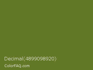 Decimal 4899098920 Color is a normal lime color and the nearest color is Fern Frond #657220. Hex code #647928 and RGB value is rgb(100,121,40). In RGB color space, this color is composed of 39% red, 47% green, 16% blue, In CMYK color space, this color is composed of 17% cyan, 0% magenta, 67% yellow , 53% black , In HSL color space, this color has a hue angle of 76° , 50% saturation and 32% lightness.