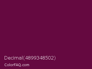 Decimal 4899348502 Color is a very dark magenta color and the nearest color is Tyrian Purple #66023c. Hex code #650940 and RGB value is rgb(101,9,64). In RGB color space, this color is composed of 40% red, 4% green, 25% blue, In CMYK color space, this color is composed of 0% cyan, 91% magenta, 37% yellow , 60% black , In HSL color space, this color has a hue angle of 324° , 84% saturation and 22% lightness.