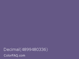 Decimal 4899480336 Color is a normal indigo color and the nearest color is Dolphin #646077. Hex code #655886 and RGB value is rgb(101,88,134). In RGB color space, this color is composed of 40% red, 35% green, 53% blue, In CMYK color space, this color is composed of 25% cyan, 34% magenta, 0% yellow , 47% black , In HSL color space, this color has a hue angle of 257° , 21% saturation and 44% lightness.