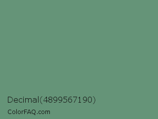 Decimal 4899567190 Color is a normal green color and the nearest color is Viridian Green #678975. Hex code #659478 and RGB value is rgb(101,148,120). In RGB color space, this color is composed of 40% red, 58% green, 47% blue, In CMYK color space, this color is composed of 32% cyan, 0% magenta, 19% yellow , 42% black , In HSL color space, this color has a hue angle of 144° , 19% saturation and 49% lightness.