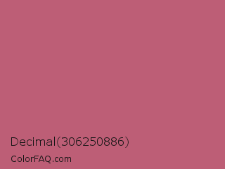 Decimal 306250886 Color is a normal red color and the nearest color is Tapestry #b05e81. Hex code #bd5e76 and RGB value is rgb(189,94,118). In RGB color space, this color is composed of 74% red, 37% green, 46% blue, In CMYK color space, this color is composed of 0% cyan, 50% magenta, 38% yellow , 26% black , In HSL color space, this color has a hue angle of 345° , 42% saturation and 55% lightness.