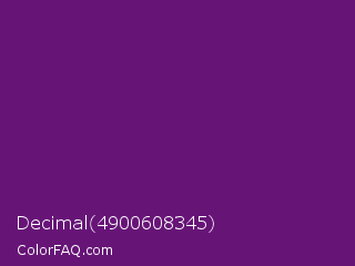Decimal 4900608345 Color is a dark purple color and the nearest color is Midnight #702670. Hex code #671477 and RGB value is rgb(103,20,119). In RGB color space, this color is composed of 40% red, 8% green, 47% blue, In CMYK color space, this color is composed of 13% cyan, 83% magenta, 0% yellow , 53% black , In HSL color space, this color has a hue angle of 290° , 71% saturation and 27% lightness.