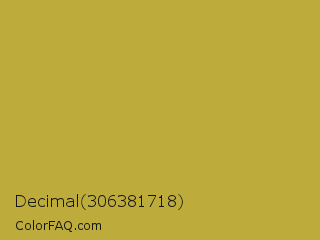 Decimal 306381718 Color is a normal yellow color and the nearest color is Brass #b5a642. Hex code #bdac3c and RGB value is rgb(189,172,60). In RGB color space, this color is composed of 74% red, 67% green, 24% blue, In CMYK color space, this color is composed of 0% cyan, 9% magenta, 68% yellow , 26% black , In HSL color space, this color has a hue angle of 52° , 52% saturation and 49% lightness.