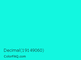 Decimal 19149060 Color is a normal cyan color and the nearest color is Bright Turquoise #08e8de. Hex code #12f7e0 and RGB value is rgb(18,247,224). In RGB color space, this color is composed of 7% red, 97% green, 88% blue, In CMYK color space, this color is composed of 93% cyan, 0% magenta, 9% yellow , 3% black , In HSL color space, this color has a hue angle of 174° , 93% saturation and 52% lightness.