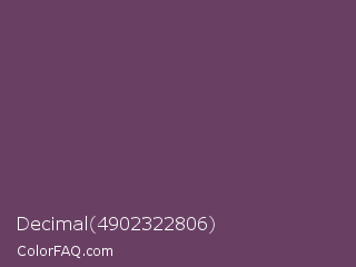 Decimal 4902322806 Color is a normal magenta color and the nearest color is Cosmic #76395d. Hex code #694064 and RGB value is rgb(105,64,100). In RGB color space, this color is composed of 41% red, 25% green, 39% blue, In CMYK color space, this color is composed of 0% cyan, 39% magenta, 5% yellow , 59% black , In HSL color space, this color has a hue angle of 307° , 24% saturation and 33% lightness.