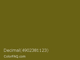 Decimal 4902381123 Color is a dark yellow color and the nearest color is Himalaya #6a5d1b. Hex code #696113 and RGB value is rgb(105,97,19). In RGB color space, this color is composed of 41% red, 38% green, 7% blue, In CMYK color space, this color is composed of 0% cyan, 8% magenta, 82% yellow , 59% black , In HSL color space, this color has a hue angle of 54° , 69% saturation and 24% lightness.
