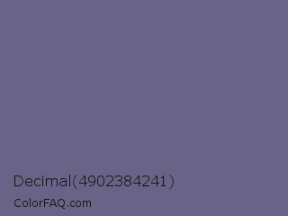 Decimal 4902384241 Color is a normal indigo color and the nearest color is Dolphin #646077. Hex code #696387 and RGB value is rgb(105,99,135). In RGB color space, this color is composed of 41% red, 39% green, 53% blue, In CMYK color space, this color is composed of 22% cyan, 27% magenta, 0% yellow , 47% black , In HSL color space, this color has a hue angle of 250° , 15% saturation and 46% lightness.