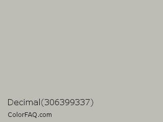 Decimal 306399337 Color is a light yellow color and the nearest color is Cotton Seed #c2bdb6. Hex code #bdbdb5 and RGB value is rgb(189,189,181). In RGB color space, this color is composed of 74% red, 74% green, 71% blue, In CMYK color space, this color is composed of 0% cyan, 0% magenta, 4% yellow , 26% black , In HSL color space, this color has a hue angle of 60° , 6% saturation and 73% lightness.