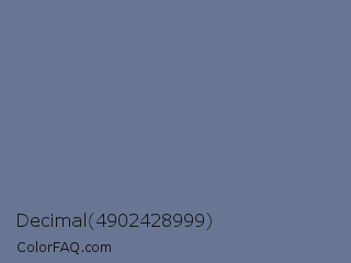 Decimal 4902428999 Color is a normal blue color and the nearest color is Lynch #697e9a. Hex code #697693 and RGB value is rgb(105,118,147). In RGB color space, this color is composed of 41% red, 46% green, 58% blue, In CMYK color space, this color is composed of 29% cyan, 20% magenta, 0% yellow , 42% black , In HSL color space, this color has a hue angle of 221° , 17% saturation and 49% lightness.