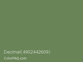 Decimal 4902442609 Color is a normal green color and the nearest color is Glade Green #61845f. Hex code #698457 and RGB value is rgb(105,132,87). In RGB color space, this color is composed of 41% red, 52% green, 34% blue, In CMYK color space, this color is composed of 20% cyan, 0% magenta, 34% yellow , 48% black , In HSL color space, this color has a hue angle of 96° , 21% saturation and 43% lightness.