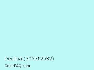 Decimal 306512532 Color is a very light cyan color and the nearest color is Charlotte #baeef9. Hex code #bdf9f6 and RGB value is rgb(189,249,246). In RGB color space, this color is composed of 74% red, 98% green, 96% blue, In CMYK color space, this color is composed of 24% cyan, 0% magenta, 1% yellow , 2% black , In HSL color space, this color has a hue angle of 177° , 83% saturation and 86% lightness.