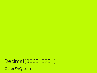 Decimal 306513251 Color is a normal lime color and the nearest color is Lime #bfff00. Hex code #bdfb03 and RGB value is rgb(189,251,3). In RGB color space, this color is composed of 74% red, 98% green, 1% blue, In CMYK color space, this color is composed of 25% cyan, 0% magenta, 99% yellow , 2% black , In HSL color space, this color has a hue angle of 75° , 98% saturation and 50% lightness.