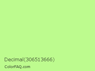 Decimal 306513666 Color is a light green color and the nearest color is Sulu #c1f07c. Hex code #bdfb8e and RGB value is rgb(189,251,142). In RGB color space, this color is composed of 74% red, 98% green, 56% blue, In CMYK color space, this color is composed of 25% cyan, 0% magenta, 43% yellow , 2% black , In HSL color space, this color has a hue angle of 94° , 93% saturation and 77% lightness.