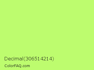 Decimal 306514214 Color is a light green color and the nearest color is Sulu #c1f07c. Hex code #bdfc6e and RGB value is rgb(189,252,110). In RGB color space, this color is composed of 74% red, 99% green, 43% blue, In CMYK color space, this color is composed of 25% cyan, 0% magenta, 56% yellow , 1% black , In HSL color space, this color has a hue angle of 87° , 96% saturation and 71% lightness.