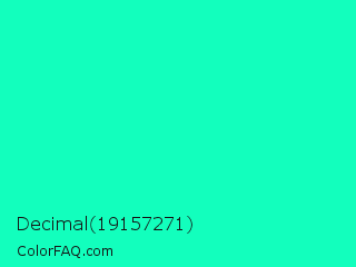Decimal 19157271 Color is a normal green color and the nearest color is Medium Spring Green #00fa9a. Hex code #12ffbd and RGB value is rgb(18,255,189). In RGB color space, this color is composed of 7% red, 100% green, 74% blue, In CMYK color space, this color is composed of 93% cyan, 0% magenta, 26% yellow , 0% black , In HSL color space, this color has a hue angle of 163° , 100% saturation and 54% lightness.