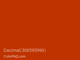 Decimal 306595990 Color is a normal orange color and the nearest color is Mahogany #c04000. Hex code #be3300 and RGB value is rgb(190,51,0). In RGB color space, this color is composed of 75% red, 20% green, 0% blue, In CMYK color space, this color is composed of 0% cyan, 73% magenta, 100% yellow , 25% black , In HSL color space, this color has a hue angle of 16° , 100% saturation and 37% lightness.