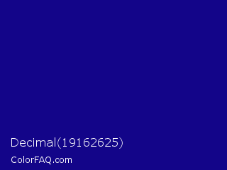 Decimal 19162625 Color is a dark indigo color and the nearest color is Ultramarine #120a8f. Hex code #130589 and RGB value is rgb(19,5,137). In RGB color space, this color is composed of 7% red, 2% green, 54% blue, In CMYK color space, this color is composed of 86% cyan, 96% magenta, 0% yellow , 46% black , In HSL color space, this color has a hue angle of 246° , 93% saturation and 28% lightness.
