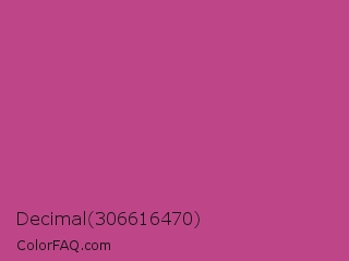 Decimal 306616470 Color is a normal magenta color and the nearest color is Mulberry #c54b8c. Hex code #be4688 and RGB value is rgb(190,70,136). In RGB color space, this color is composed of 75% red, 27% green, 53% blue, In CMYK color space, this color is composed of 0% cyan, 63% magenta, 28% yellow , 25% black , In HSL color space, this color has a hue angle of 327° , 48% saturation and 51% lightness.
