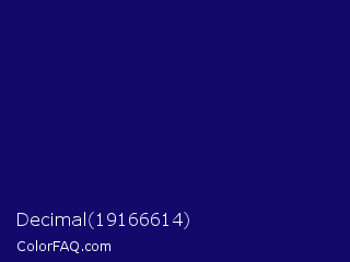 Decimal 19166614 Color is a dark indigo color and the nearest color is Arapawa #110c6c. Hex code #13096c and RGB value is rgb(19,9,108). In RGB color space, this color is composed of 7% red, 4% green, 42% blue, In CMYK color space, this color is composed of 82% cyan, 92% magenta, 0% yellow , 58% black , In HSL color space, this color has a hue angle of 246° , 85% saturation and 23% lightness.