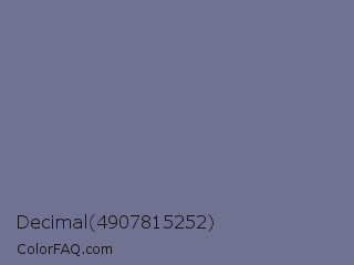 Decimal 4907815252 Color is a normal blue color and the nearest color is Rhythm #777696. Hex code #717192 and RGB value is rgb(113,113,146). In RGB color space, this color is composed of 44% red, 44% green, 57% blue, In CMYK color space, this color is composed of 23% cyan, 23% magenta, 0% yellow , 43% black , In HSL color space, this color has a hue angle of 240° , 13% saturation and 51% lightness.