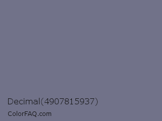 Decimal 4907815937 Color is a normal blue color and the nearest color is Storm Gray #717486. Hex code #717289 and RGB value is rgb(113,114,137). In RGB color space, this color is composed of 44% red, 45% green, 54% blue, In CMYK color space, this color is composed of 18% cyan, 17% magenta, 0% yellow , 46% black , In HSL color space, this color has a hue angle of 238° , 10% saturation and 49% lightness.
