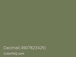 Decimal 4907823429 Color is a normal lime color and the nearest color is Limed Ash #747d63. Hex code #717959 and RGB value is rgb(113,121,89). In RGB color space, this color is composed of 44% red, 47% green, 35% blue, In CMYK color space, this color is composed of 7% cyan, 0% magenta, 26% yellow , 53% black , In HSL color space, this color has a hue angle of 75° , 15% saturation and 41% lightness.