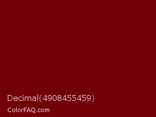 Decimal 4908455459 Color is a very dark red color and the nearest color is Japanese Maple #780109. Hex code #720007 and RGB value is rgb(114,0,7). In RGB color space, this color is composed of 45% red, 0% green, 3% blue, In CMYK color space, this color is composed of 0% cyan, 100% magenta, 94% yellow , 55% black , In HSL color space, this color has a hue angle of 356° , 100% saturation and 22% lightness.