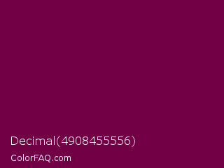 Decimal 4908455556 Color is a very dark magenta color and the nearest color is Pompadour #660045. Hex code #720044 and RGB value is rgb(114,0,68). In RGB color space, this color is composed of 45% red, 0% green, 27% blue, In CMYK color space, this color is composed of 0% cyan, 100% magenta, 40% yellow , 55% black , In HSL color space, this color has a hue angle of 324° , 100% saturation and 22% lightness.